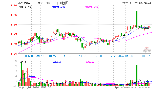 1月27日,MSCIETF(512520)开盘跌0.47%,报1.484元。MSCIETF(512520)重仓股方面,贵州茅台开盘涨0.22%,宁德时代涨0.83%,招商银行涨0.11%,工业富联涨0.42%,中国平安涨0.27%,紫金矿业涨1.85%,中际旭创涨0.03%,寒武纪涨0.00%,长江电力涨0.00%,农业银行涨0.58%。